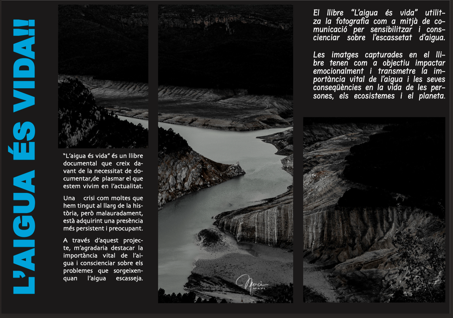 L'Aigua és Vida, és un llibre documental carregat d'històries autèntiques i commedores que posen de manifest una realitat incontestable: l'aigua és un bé escàs i imprescindible. "L'Aigua és Vida" es una obra que consta de dues parts fonamentals: La primera neix de la necessitat de documentar la situació territorial on vaig néixer. Lleida. La segona iniciativa, Al igual que TERRITORI EMOCIONAL , "L'AIGUA ÉS VIDA" també és un llibre solidari, on els recursos obtinguts es destinaran a l projecte que porta a terme el moviment 1km1vida.